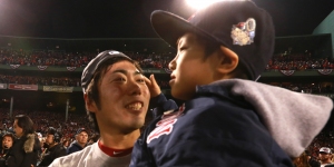 BOSTON – OCTOBER 30: Boston Red Sox relief pitcher Koji Uehara (#19) celebrates with his son Kaz. The Boston Red Sox host the St. Louis Cardinals at Fenway Park for Game Six of the 2013 Major League Baseball World Series, Oct. 30, 2013. (Photo by Barry Chin/The Boston Globe via Getty Images)